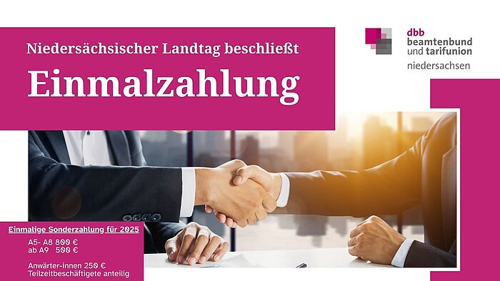 Der dbb niedersachsen begrüßt im Grundsatz die Gewährung der Sonderzahlung für 2025, die heute vom Niedersächsischen Landtag beschlossen wurde. Insgesamt sollen die niedersächsischen Beamtinnen und Beamten für das Jahr 2025 rückwirkend eine Sonderzahlung in Höhe von 800€, bzw. 500€ (je nach Besoldungsgruppe) erhalten.