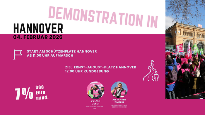In der Einkommensrunde 2025/2026 hat die TdL auch in der zweiten Verhandlungsrunde kein Angebot vorgelegt. Deshalb ruft der dbb alle betroffenen Beschäftigten in Niedersachsen zu einem ganztägigen Warnstreik am 4. Februar 2026 in Hannover auf. Der Aufmarsch vom Schützenplatz beginnt um 11:00 Uhr, die zentrale Kundgebung findet ab 12:00 Uhr auf dem Ernst-August-Platz statt. Gefordert werden unter anderem 7 % mehr Entgelt (mindestens 300 €), höhere Ausbildungsvergütungen sowie verbesserte Zuschläge und Arbeitsbedingungen.